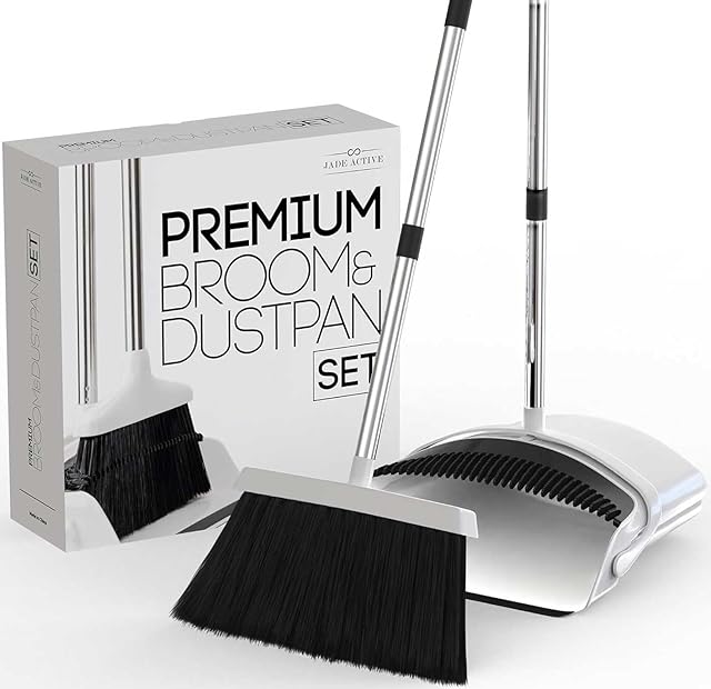Broom and Dustpan Set for Home - Premium Long Handled Broom Dustpan Combo - Upright Standing Lobby Broom and Dust Pan Brush w/Handle - Great Edge, Lightweight and Robust
